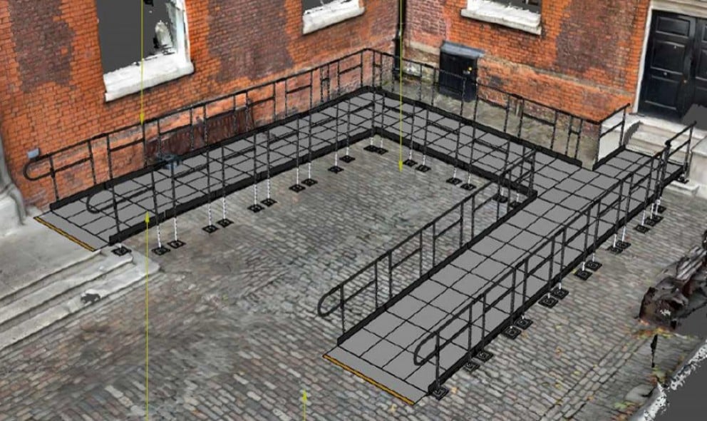 From this, we created detailed 2D drawings and 3D visualisations to show how the ramp would look in place, set against a virtual model of the New Armouries.