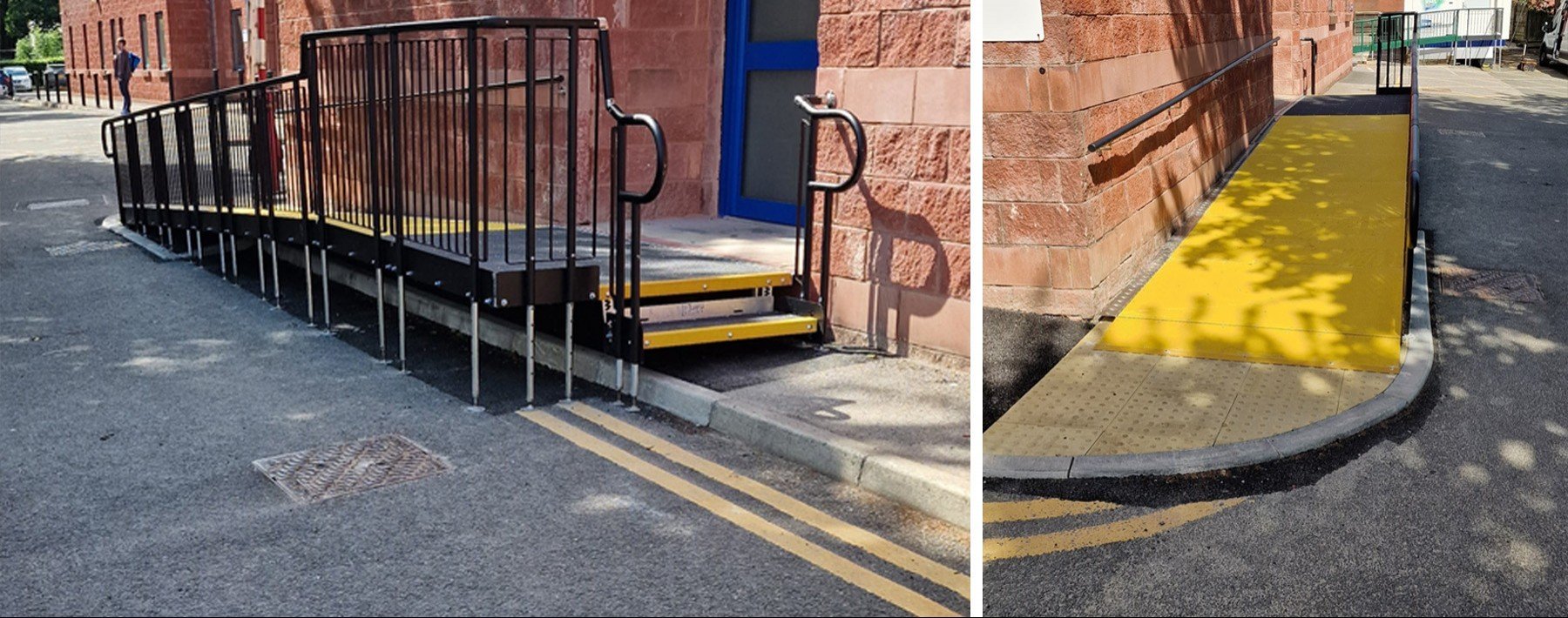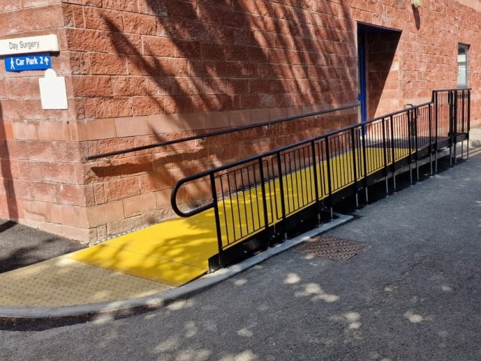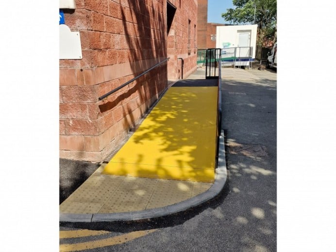 - Yellow GRP (Glass Reinforced Plastic) – A non-corrosive, slip-resistant material ideal for high-footfall public areas such as schools, hospitals, train stations and airports. Yellow was chosen because its bright, high-contrast colour is easier for visually impaired users to detect, helping them identify the system’s nose and any changes in level.