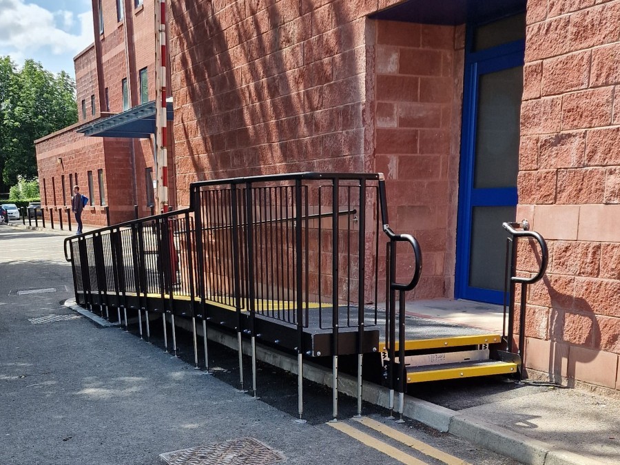 Our modular ramp could easily accommodate the varying ground levels thanks to its telescopic legs, and it remains ideal for temporary projects such as this, where flexibility, ease of installation, and straightforward future removal are key considerations.
